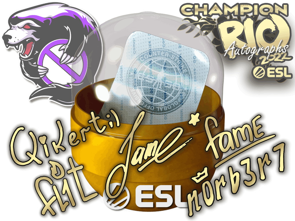 This item commemorates the IEM Rio 2022 CS:GO Championship. This capsule contains a single Paper, Glitter, Holo, or Gold sticker autographed by one of the Champions players at Rio 2022. 50% of the proceeds from the sale of this capsule support the included players and organizations. That sticker can be applied to any weapon you own and can be scraped to look more worn. You can scrape the same sticker multiple times, making it a bit more worn each time, until it is removed from the weapon.